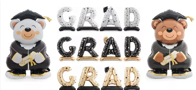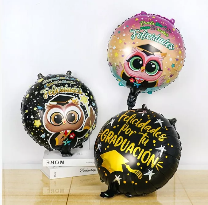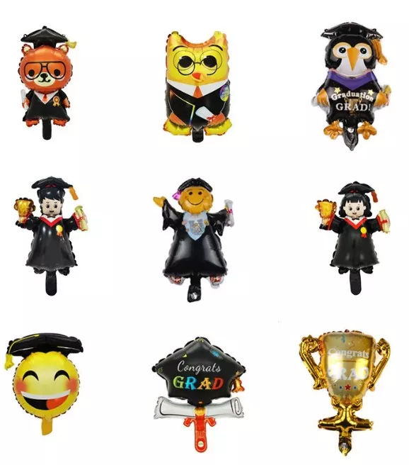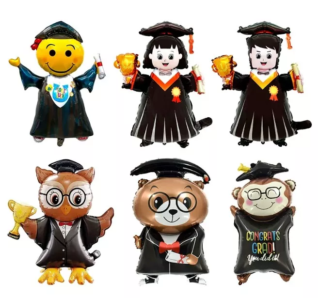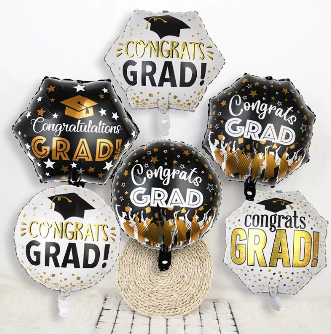 Os balões de folha de graduação geralmente são feitos de papel alumínio leve com um brilho metálico. A superfície é coberta com um filme brilhante que pode refletir a luz e apresentar um efeito atraente. Os tamanhos comuns variam de 12 polegadas a 36 polegadas, atendendo às necessidades de suspensão ou colocação no piso em diferentes espaços. A superfície pode ser impressa com padrões de limpeza de graduação claros, palavras temáticas de "graduação", logotipos de ano e suporta altamente os emblemas escolares personalizados, lotes escolares ou bênçãos específicas, que são de grande valor comemorativo.